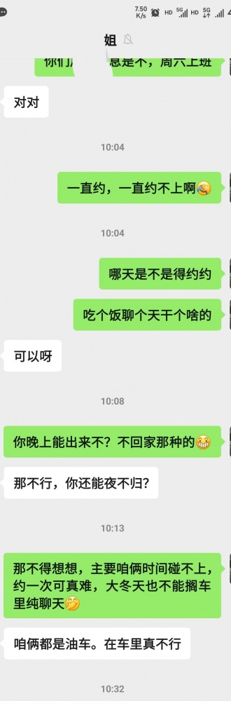 约了几次,反正不拒绝,但是就是约不上时间,上次吃完饭在车里又亲又摸,要脱她裤子的时候,她说来姨妈了,我摸了摸真是垫的卫生巾。然后就一直想约出来操她,时间就是对不上。这大姐岁数大点40多,175的身高挺瘦腿长,就是长得特一般。得想想招